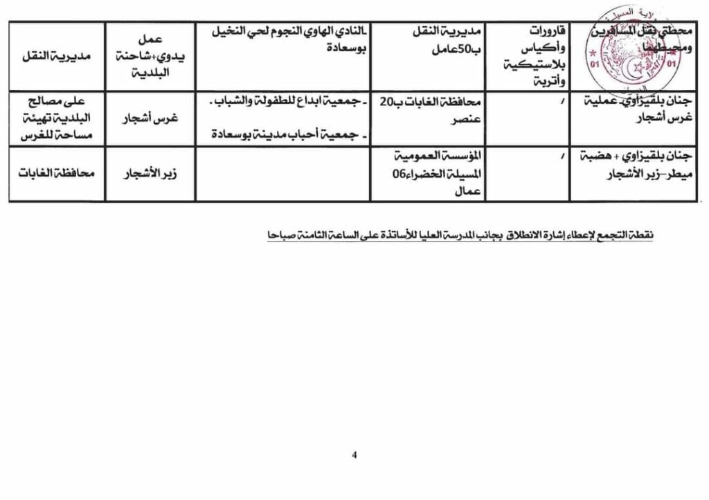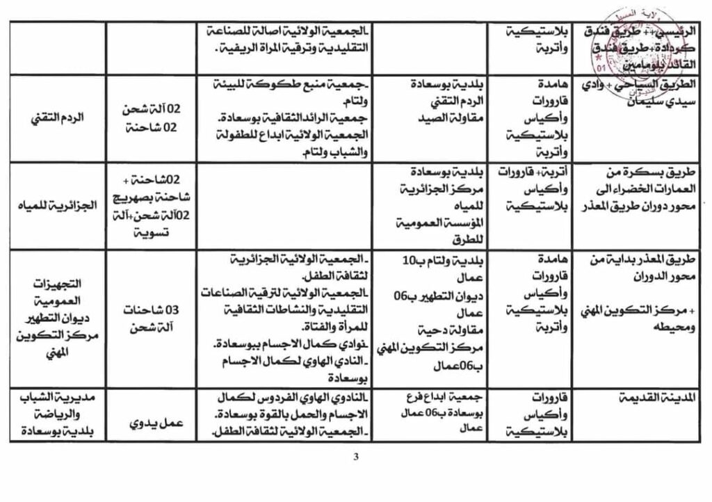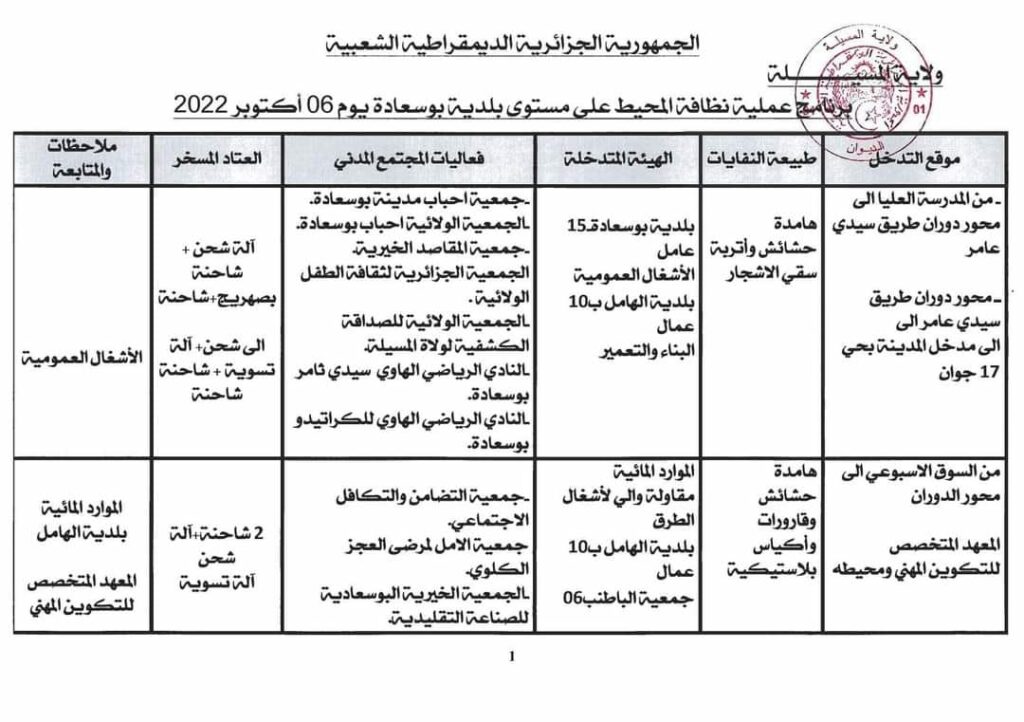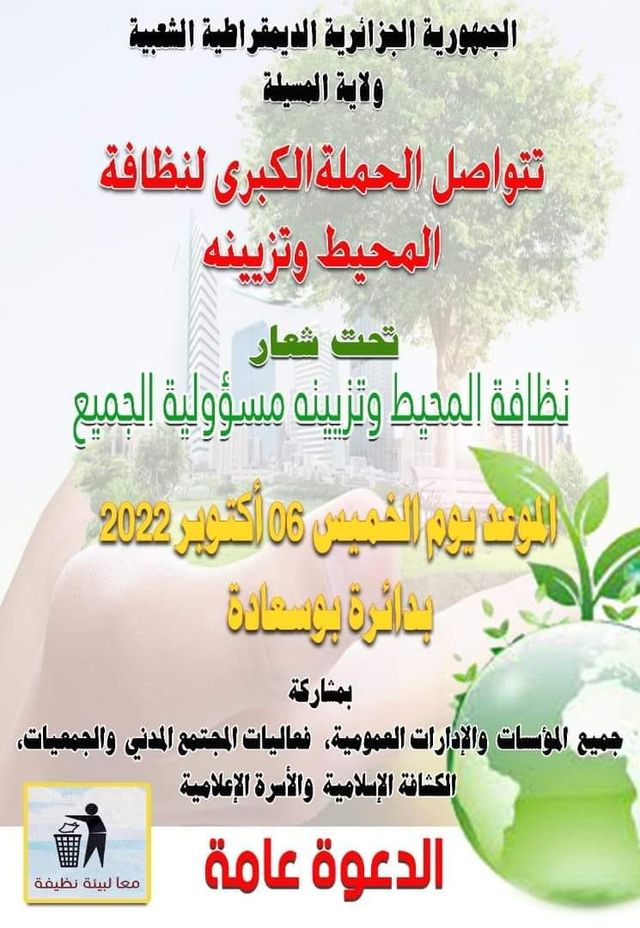 الموعد غدا بدائرة بوسعادة .. حسب البرنامج المسطر في إطار مواصلة العملية الوطنية الكبرى لتنظيف المحيط وتزيينه5 أكتوبر، 20220 3 شاركها فيسبوك X مشاركة عبر البريد طباعة