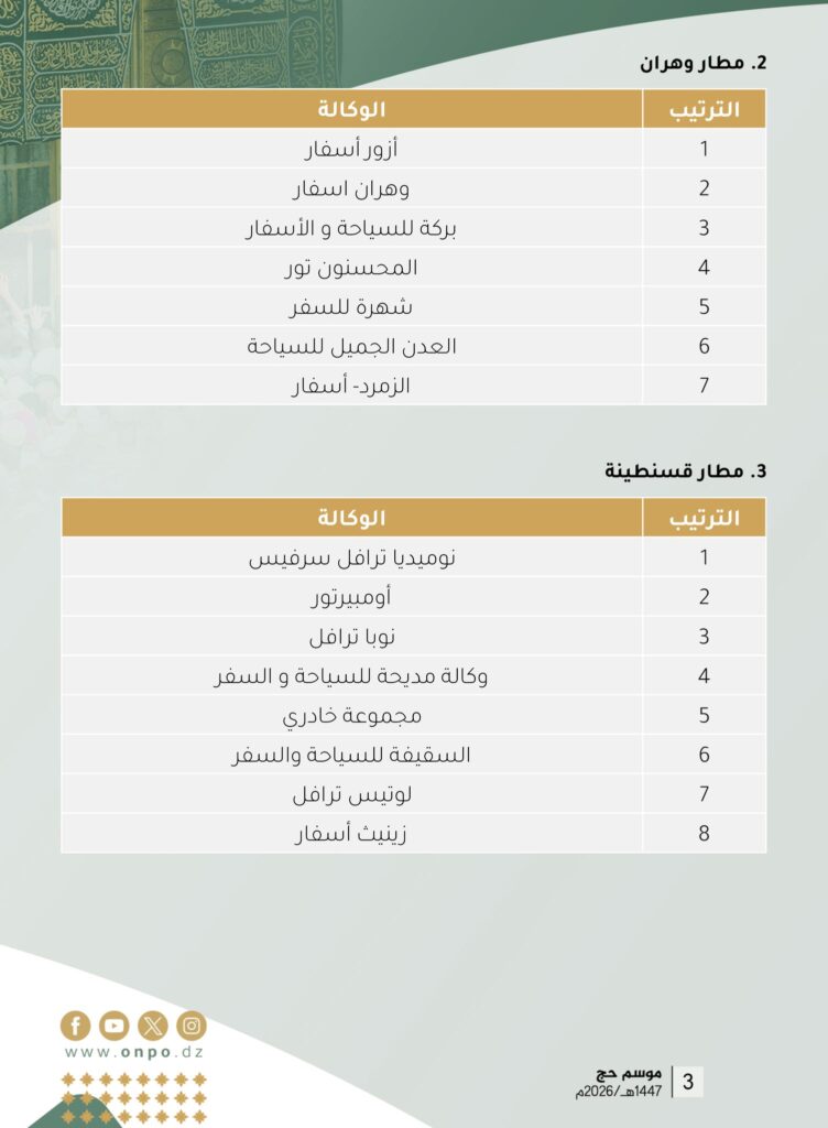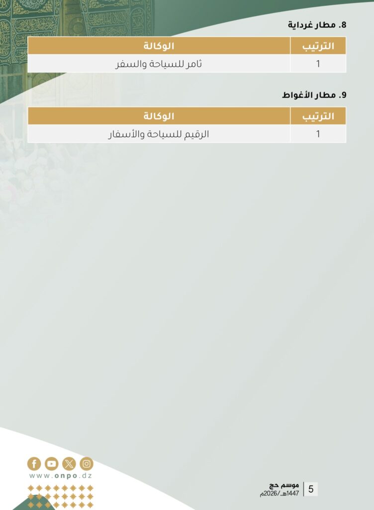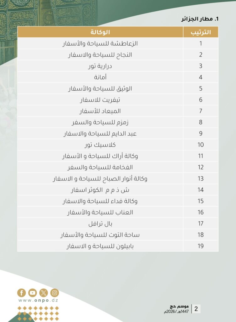 بناء على القرار رقم 214 المؤرخ في 08 ربيع الأول 1447هـ الموافق 01 سبتمبر 2025م الصادر عن السيد وزير الشؤون الدينية والأوقاف المتضمن القائمة النهائية لوكالات السياحة والأسفار المؤهلة لتنظيم عملية الحج لموسم 1447هـ / 2026م.