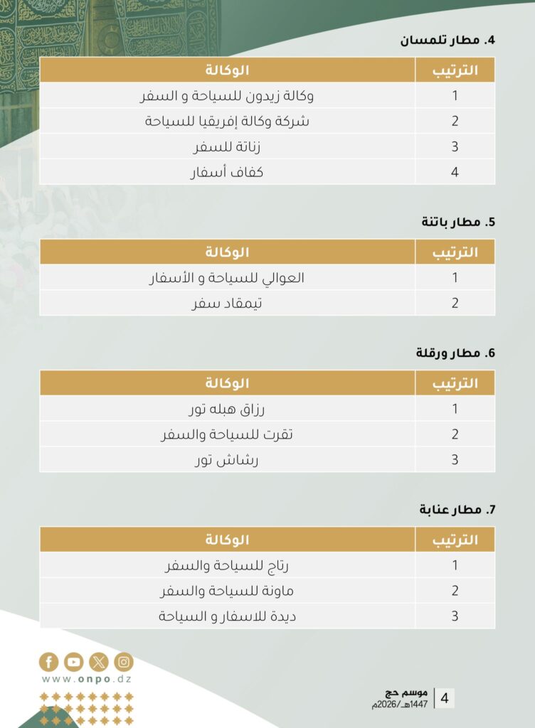 يعلن الديوان الوطني للحج والعمرة عن القائمة النهائية وفق مطارات الإقلاع المعتمدة.