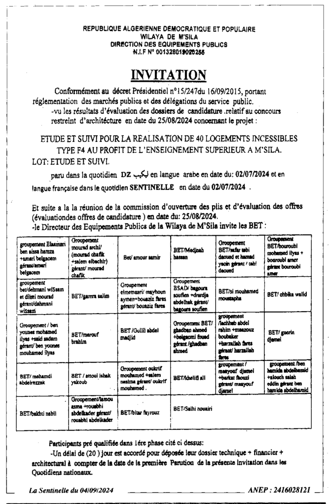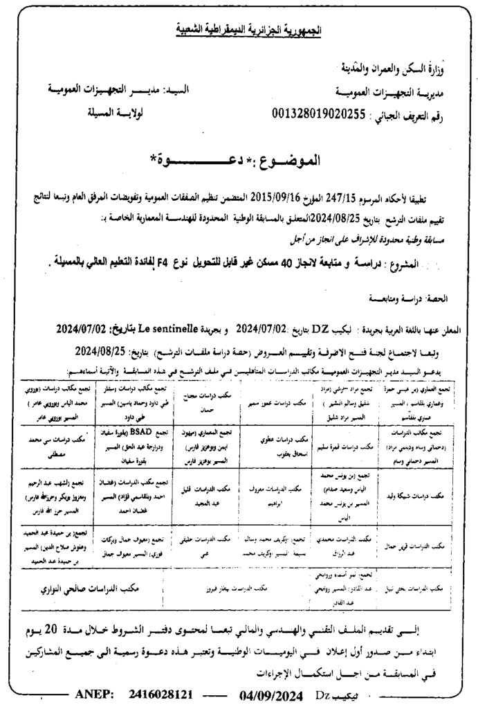 المسابقة الوطنية المحدودة للهندسة المعمارية لدراسة ومتابعة لانجاز 40 مسكن غير قابل للتحويل نوع F4 لفائدة التعليم العالي بالمسيلة/ مديرية التجهيزات العمومية لولاية المسيلة