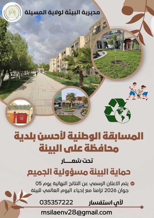 تنظم وزارة البيئة وجودة الحياة ووزارة الداخلية والجماعات المحلية والنقل المسابقة الوطنية لأحسن بلدية محافظة على البيئة تحضيرا لليوم العالمي للبيئة الموافق 5 جوان 2026، تحت شعار “حماية البيئة مسؤولية الجميع” وهي مبادرة تهدف إلى تتويج خمس بلديات تحقق نموذجا ناجحا في حماية البيئة عامة والتسيير المدمج للنفايات والولوج للاقتصاد الدائري خاصة، التي ستكون انطلاقا من 05 فيفري 2026، وعليه نعلم جميع البلديات الراغبين في المشاركة أن إيداع ملفات الترشح سيكون ابتداءً من تاريخ الاعلان عن المسابقة إلى غاية 31 مارس 2026 وذلك وفقا للمعايير التالية: