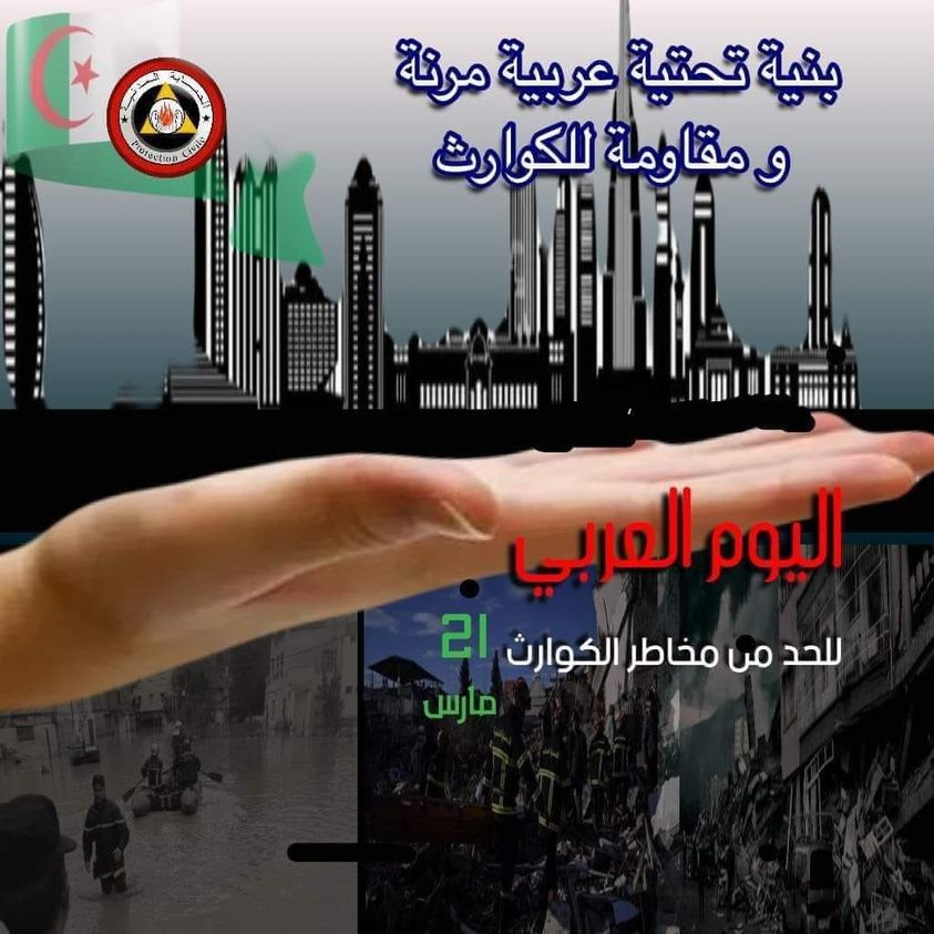في إطار الاحتفال باليوم العربي للحد من مخاطر الكوارث الموافق 21 مارس 2024، شرعت المصالح المختصة (الحماية المدنية، الري، محافظات الغابات، السكن والعمران، الأشغال العمومية) على مستوى 58 ولاية في إحياء هذا الحدث خلال الفترة من 21 إلى 28 مارس 2024 تحت شعار: بنية تحتية عربية مرنة ومقاومة للكوارث.