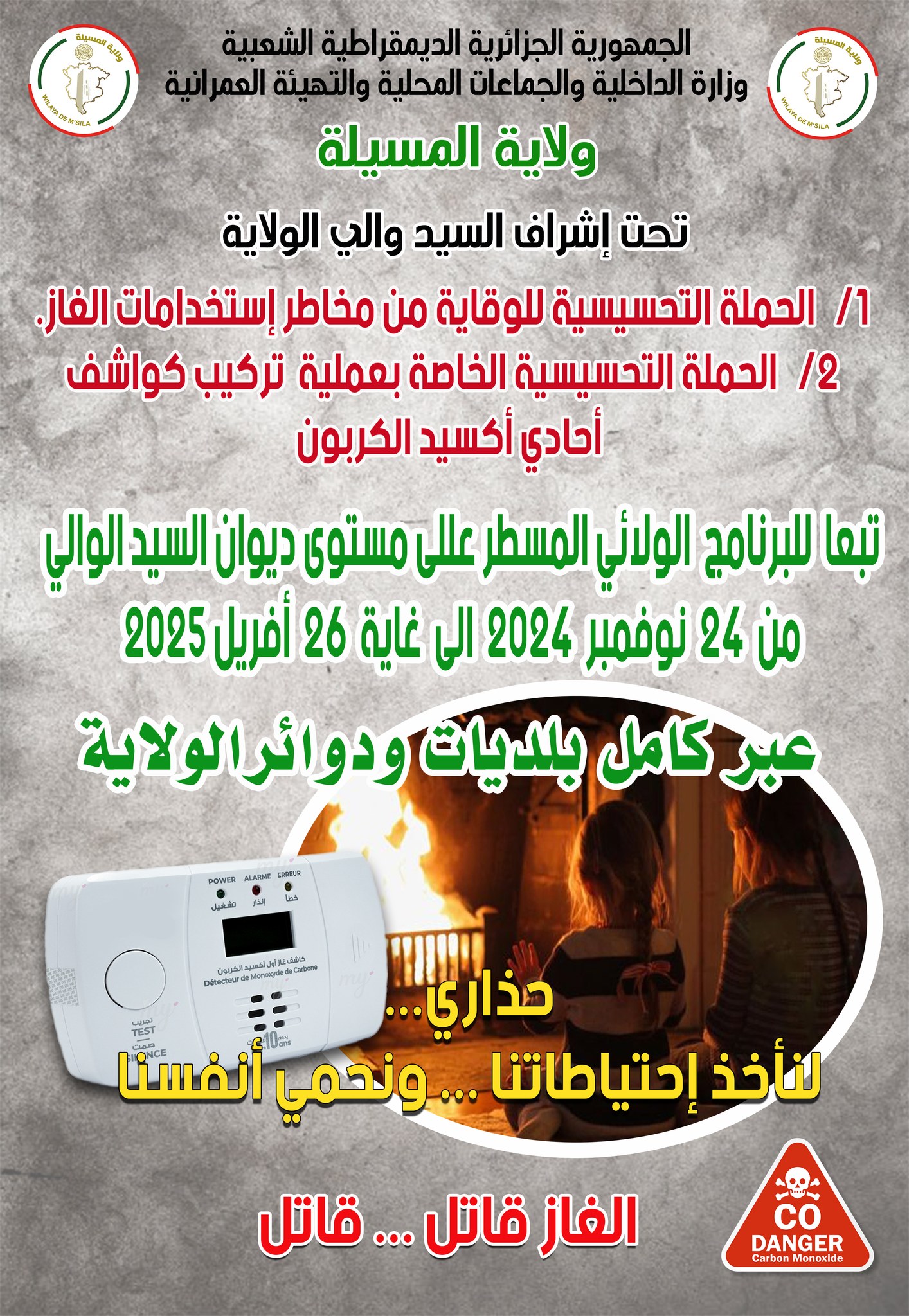 المسيلة/ تحت إشراف السيد والي الولاية، مواصلة لتنفيذ البرنامج الولائي المسطر على مستوى ديوان السيد الوالي، إعطاء إشارة انطلاق الحملة التحسيسية بدائرة سيدي عيسى ودائرة بن سرور، الحملة التحسيسية للوقاية من مخاطر استخدامات الغاز والخاصة بمرافقة عمليات تركيب كواشف أحادي أوكسيد الكربون تحت شعار الوقاية من مخاطر استخدامات الغاز مسؤوليتنا جميعا، ضمن البرنامج الولائي المسطر على مستوى ديوان الولاية، وذلك خلال الفترة الممتدة من 24 نوفمبر 2024 إلى 26 أفريل 2025، بمعدل دائرتين كل يوم سبت من كل أسبوع، وبمشاركة مختلف المصالح على غرار مصالح: الحماية المدنية، سونلغاز، وفعاليات المجتمع المدني.