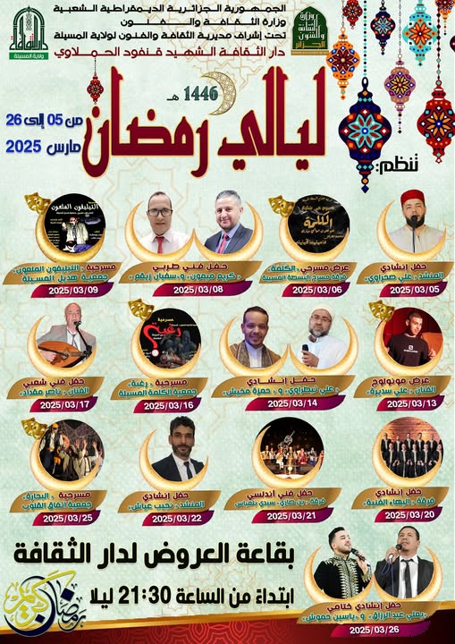 برنامج سهرات ليالي رمضان 2025 – 1446 من 05 إلى 26 مارس 2025 إبتداءً من الساعة التّاسعة والنصف (21:30 سا ) بقاعة العروض لدار الثقافة.