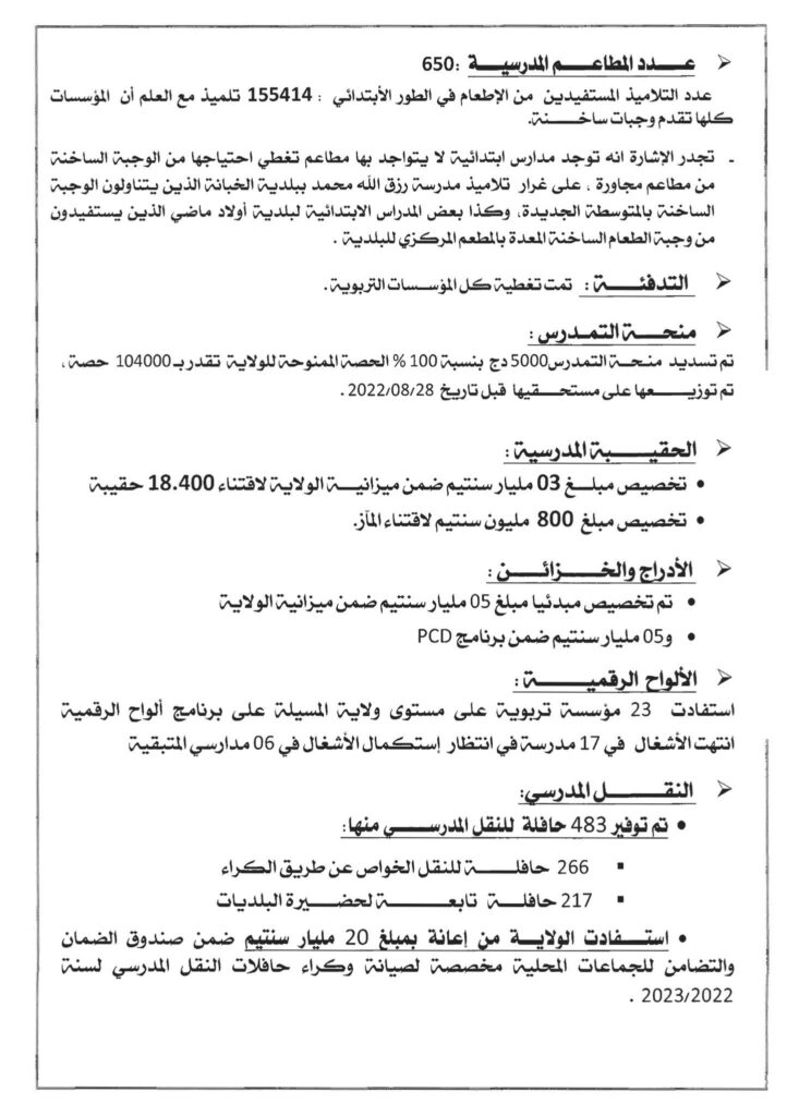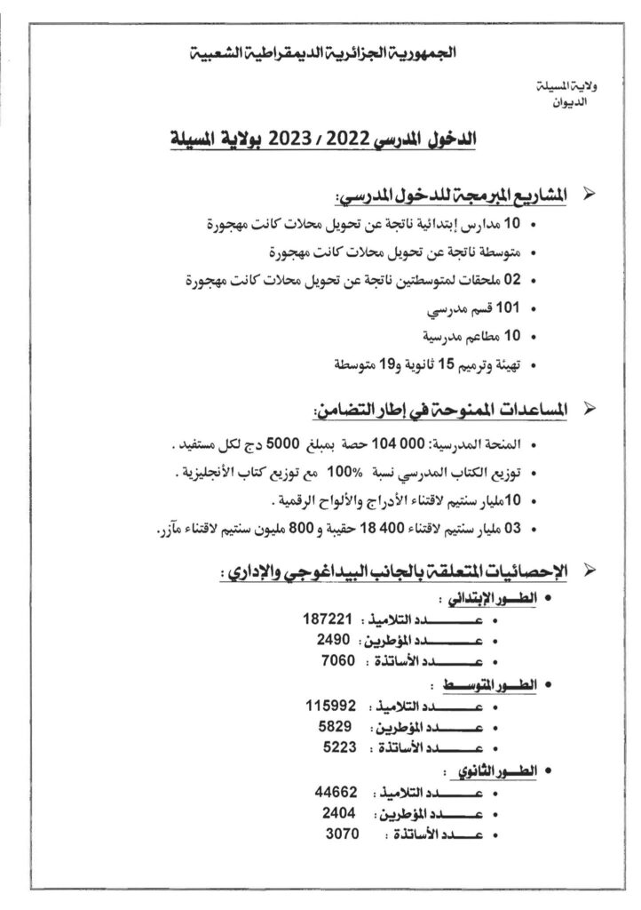 بطاقة معلومات حول الدخول المدرسي للموسم 2022-2023 بولاية المسيلة