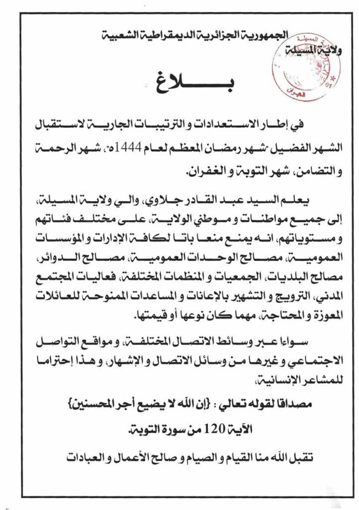 بــلاغ من أجل الترتيبات الجارية لاستقبال شهر رمضان