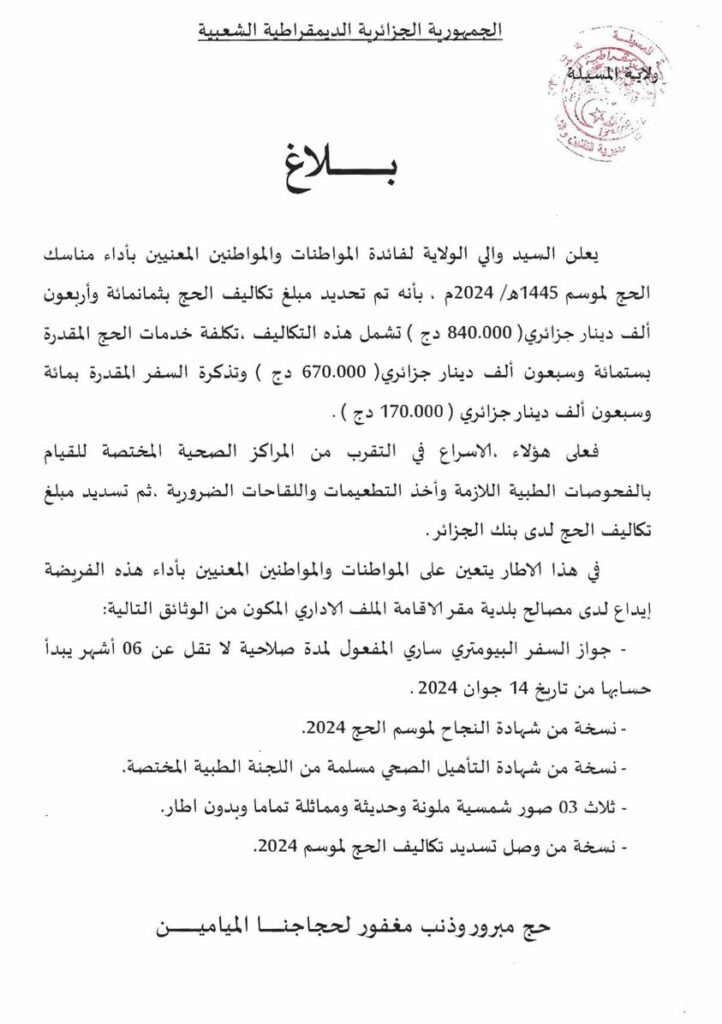 بلاغ بخصوص أداء مناسك الحج لموسم 1445 هـ / 2024 م