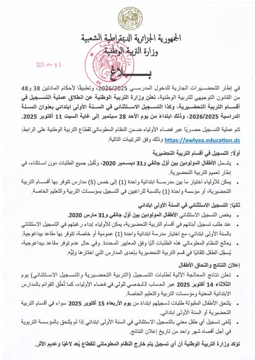 بلاغ بخصوص التسجيل في أقسام التربية التحضيرية والتسجيل الاستثنائي في السنة الأولى ابتدائي السنة الدراسية 2026/2025