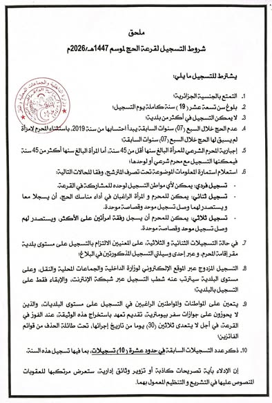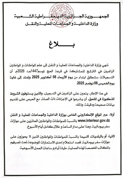بلاغ بخصوص التسجيل في القرعة لأداء مناسك الحج لموسم 1447هـ/ 2026 م