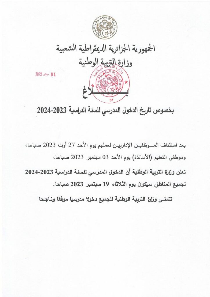 بلاغ بخصوص تاريخ الدخول المدرسي للسنة الدراسية 2023-2024