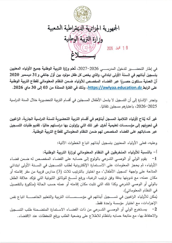 بلاغ بخصوص تسجيل تلاميذ السنة الأولى ابتدائي عبر الفضاء المخصص للأولياء
