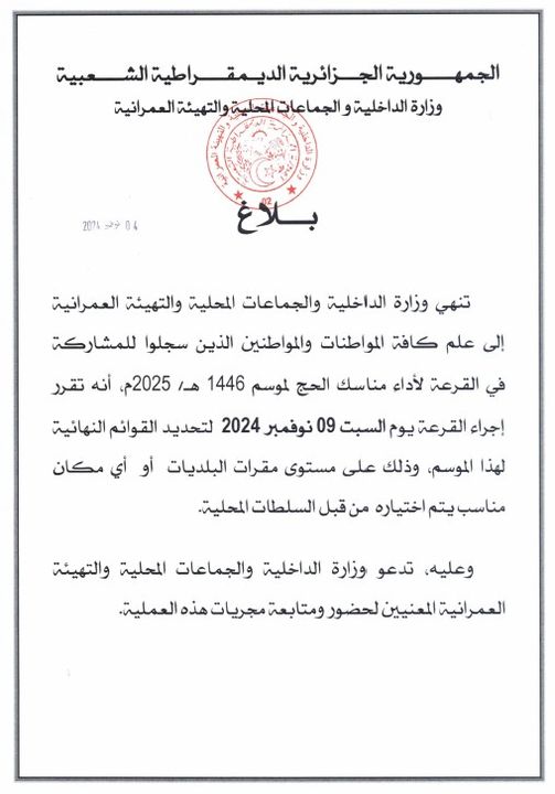 بلاغ بخصوص موعد إجراء القرعة لأداء مناسك الحج لموسم 1446هــ / 2025 م