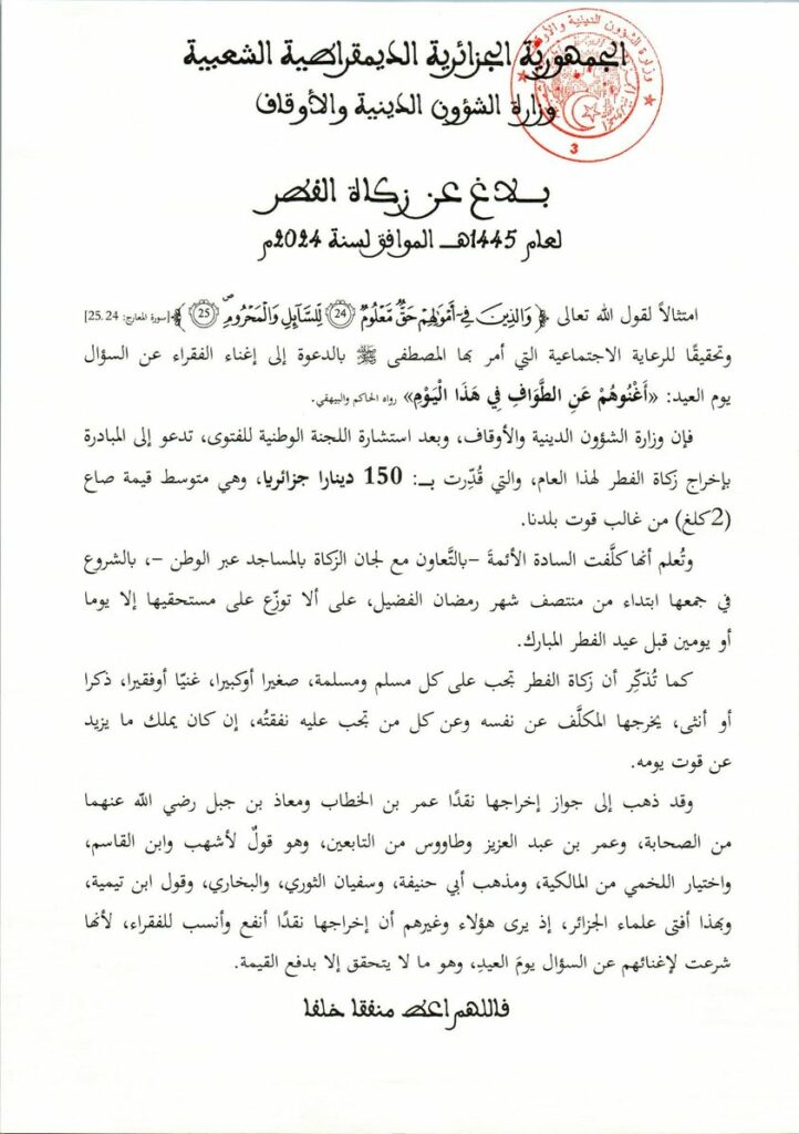 بلاغ عن زكاة الفطر لعام 1445 هـ / 2024 م