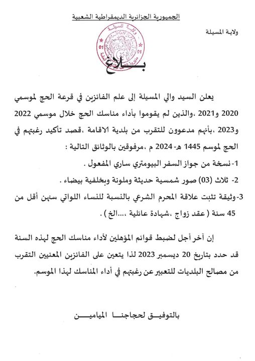 بلاغ/ قرعة الحج لموسمي 2020 و2021