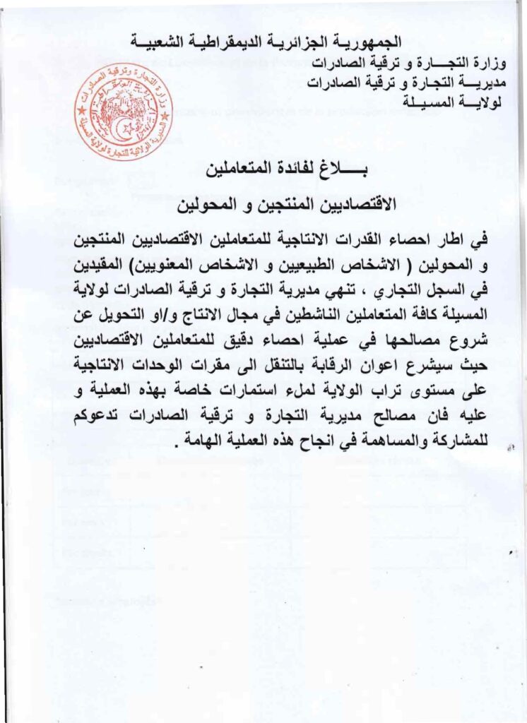 بلاغ/ مديرية التجارة وترقية الصادرات لولاية المسيلة