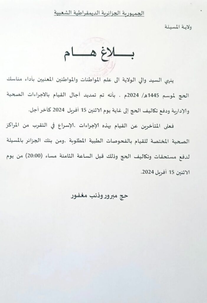 بلاغ هــام/ أداء مناسك الحج لموسم 1445 هـ /2024 م