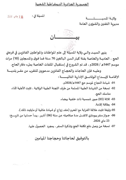 بيان بخصوص الفائزين في قرعتي الحج العادية والخاصة/ مديرية التقنين والشؤون العامة لولاية المسيلة