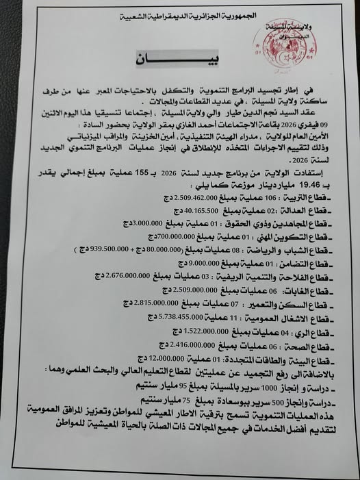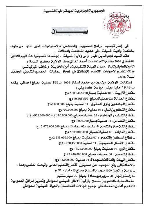 بيان بخصوص تقييم الاجراءات للانطلاق في انجاز البرنامج التنموي الجديد 2026