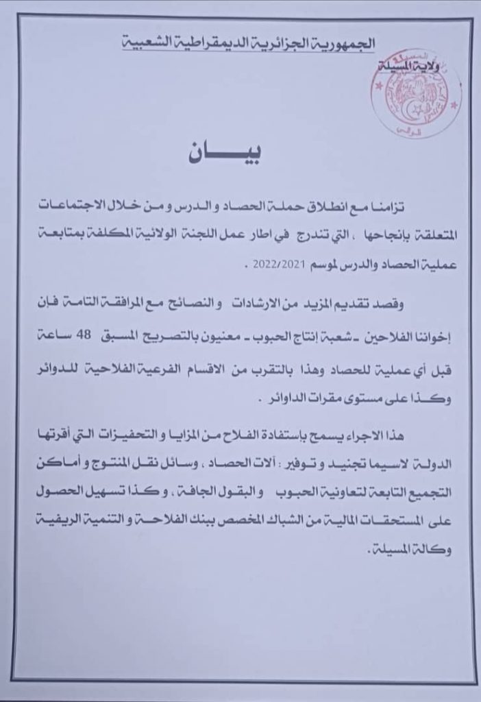 بيان بخصوص متابعة عملية الحصاد والدرس لموسم 2021/2022