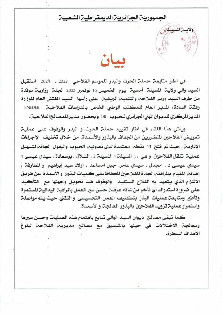بيان/ حملة الحرث والبذر للموسم الفلاحي 2023-2024