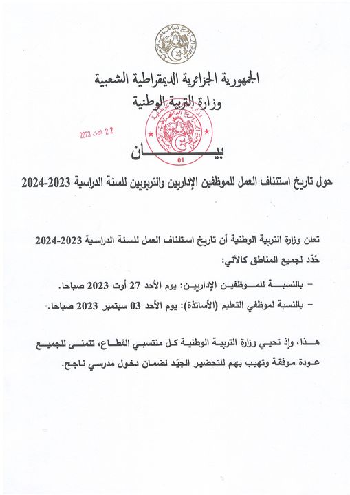 بيان حول استئناف العمل للموظفين الإداريين والتربويين 2023-2024
