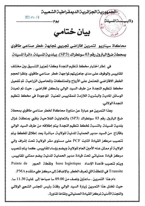 بيان ختامي / انطلاق تطبيق محاكاة للتمرين الافتراضي التجريبي لمجابهة خطر صناعي طاقوي