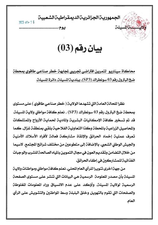 بيان رقم 03/ انطلاق تطبيق محاكاة للتمرين الافتراضي التجريبي لمجابهة خطر صناعي طاقوي
