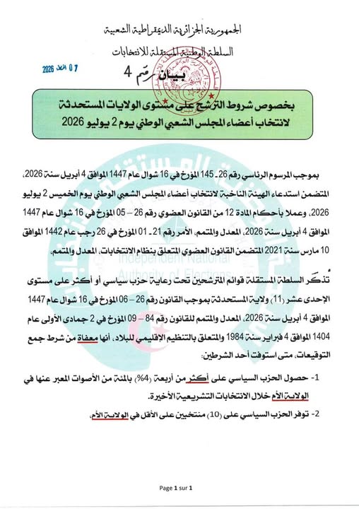 بيان رقم 04 السلطة الوطنية المستقلة للإنتخابات