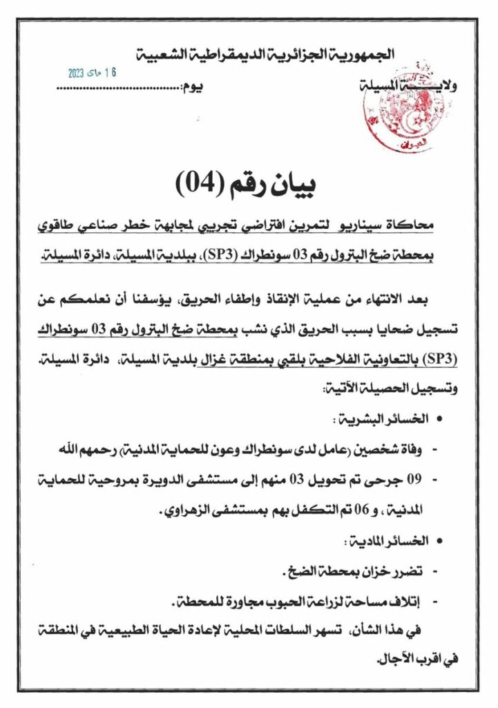 بيان رقم 04/ انطلاق تطبيق محاكاة للتمرين الافتراضي التجريبي لمجابهة خطر صناعي طاقوي