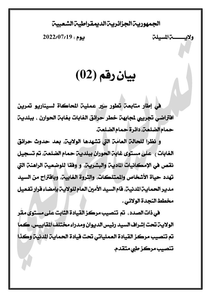بيان رقم 2: تطبيق محاكاة للتمرين الافتراضي التجريبي الثاني لمجابهة خطر حرائق الغابات