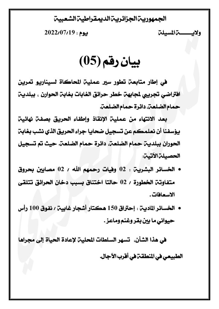 بيان رقم 5: تطبيق محاكاة للتمرين الافتراضي التجريبي الثاني لمجابهة خطر حرائق الغابات