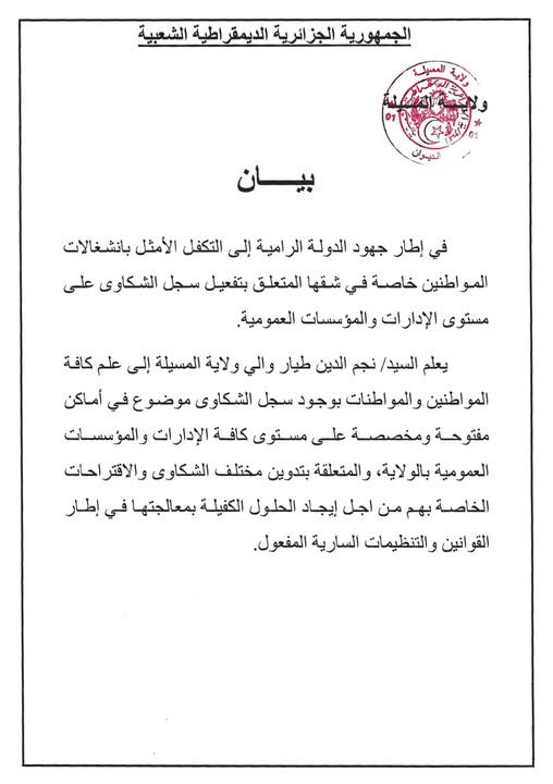 بيان/ سجل الشكاوى موضوع في أماكن مفتوحة ومخصصة على مستوى الادارات والمؤسسات