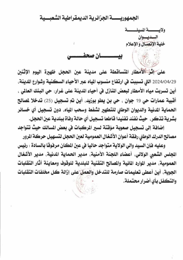 بيان صحفي الأمطار المتساقطة على مدينة الحجل