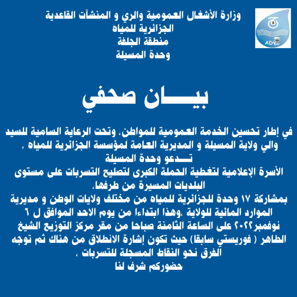 بيان صحفي/ الجزائرية للمياه وحدة المسيلة