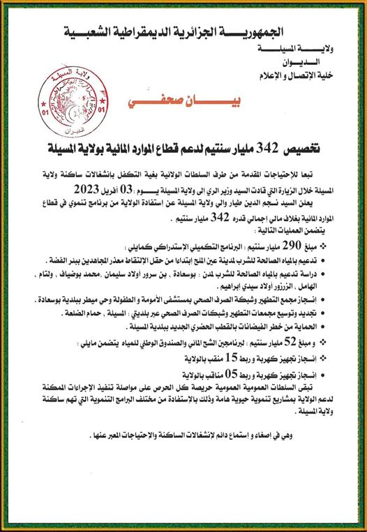 بيان صحفي/ تخصيص 342 مليار سنتيم لدعم قطاع الموارد المائية بولاية المسيلة