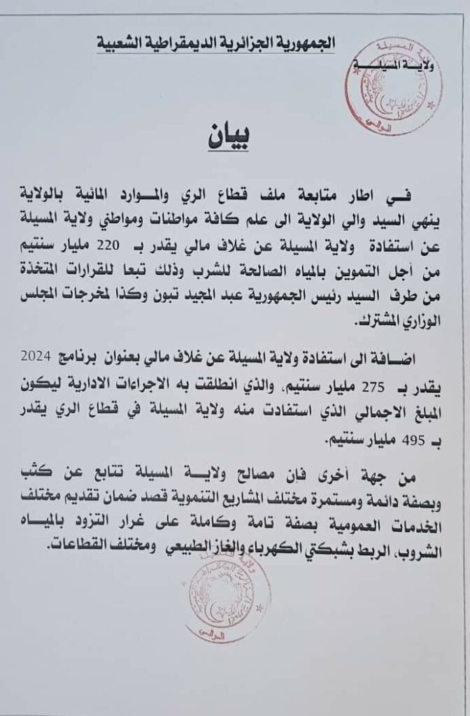 بيان/ قطاع الري والموارد المائية بولاية المسيلة