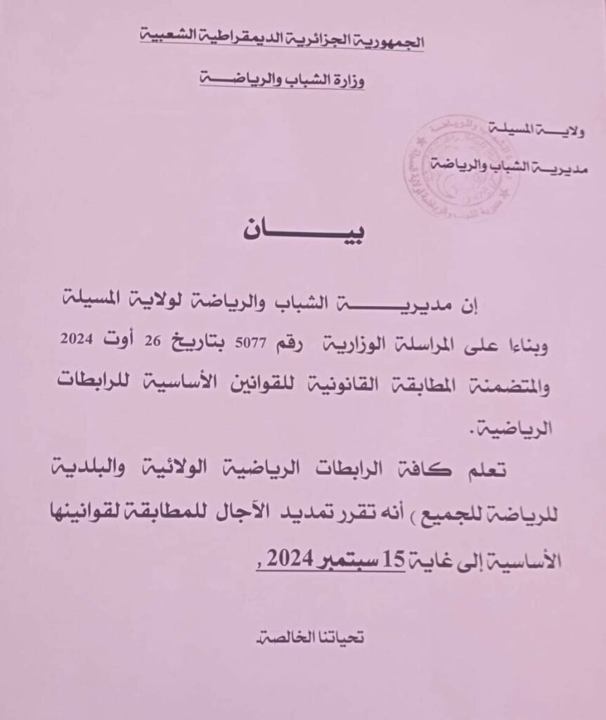 بيان/ مديرية الشباب والرياضة لولاية المسيلة
