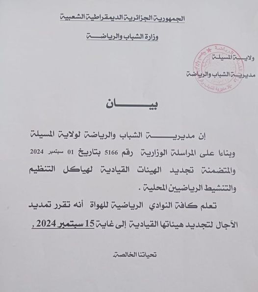 بيان/ مديرية الشباب والرياضة لولاية المسيلة