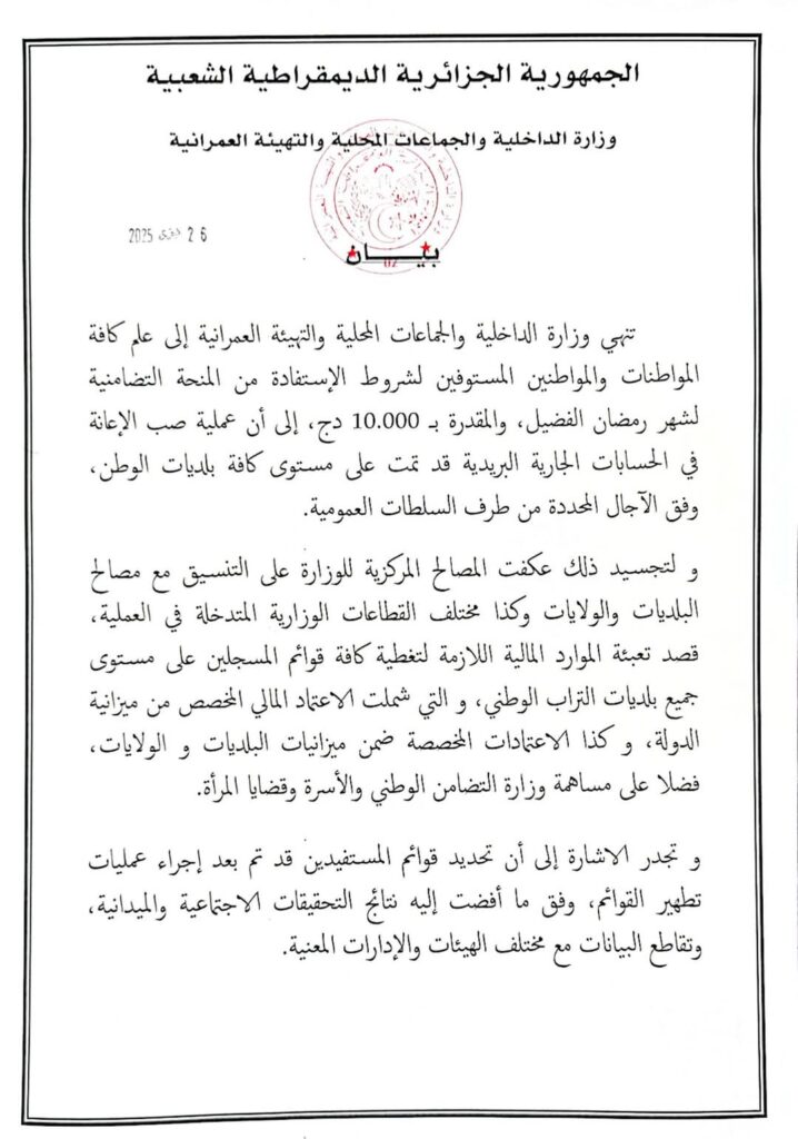 بيان/ وزارة الداخلية والجماعات المحلية والاهيئة العمرانية