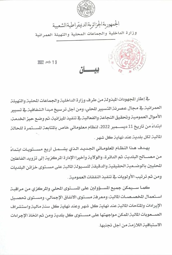 بيان/ نظام معلوماتي خاص بمتابعة الحالة المالية لكل بلدية19 ديسمبر، 20220 12 شاركها فيسبوك X مشاركة عبر البريد طباعة