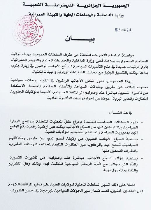 هام/ إقرار ترتيبات جديدة في منح التأشيرة السياحية لفائدة السياح الأجانب الراغبين في زيارة الجنوب.28 ديسمبر، 20220 11 شاركها فيسبوك X مشاركة عبر البريد طباعة