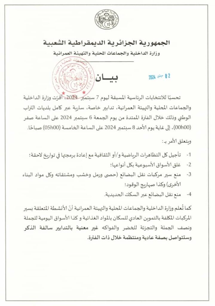 بيان/ وزارة الداخلية والجماعات المحلية والتهيئة العمرانية