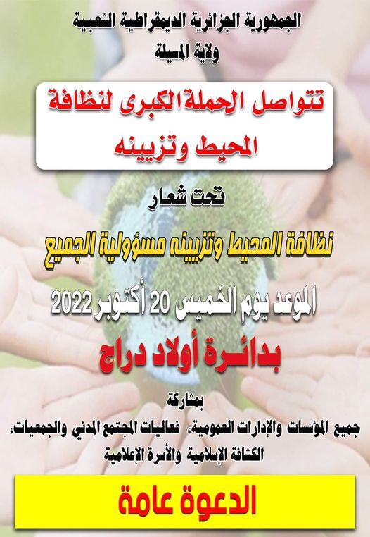 الموعد غدا .. تتواصل العملية الكبرى لتنظيف المحيط وتزيينه والمحطة يوم الخميس 20 أكتوبر 2022 بدائرة أولاد دراج وفق البرنامج المسطر: