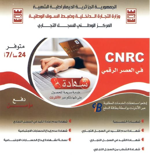 يذكر المركز الوطني للسجل التجاري جميع التجار والمتعاملين الإقتصاديين وكذا المواطنين بإستغلال الخدمات المتوفرة عن بعد 24 ساعة/24 و7 أيام/7، عبر البوابة الإلكترونية سجل كوم