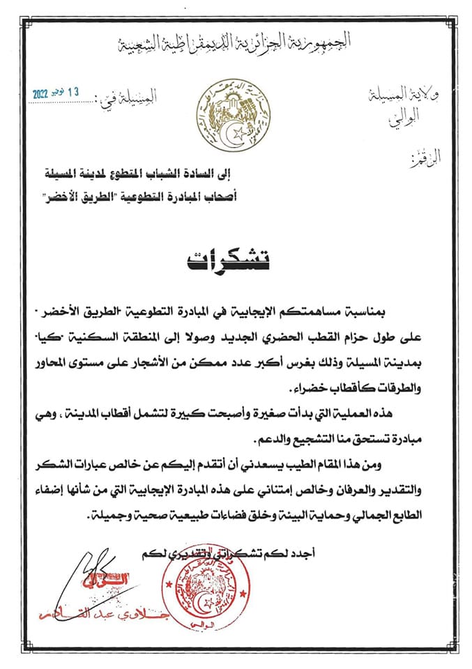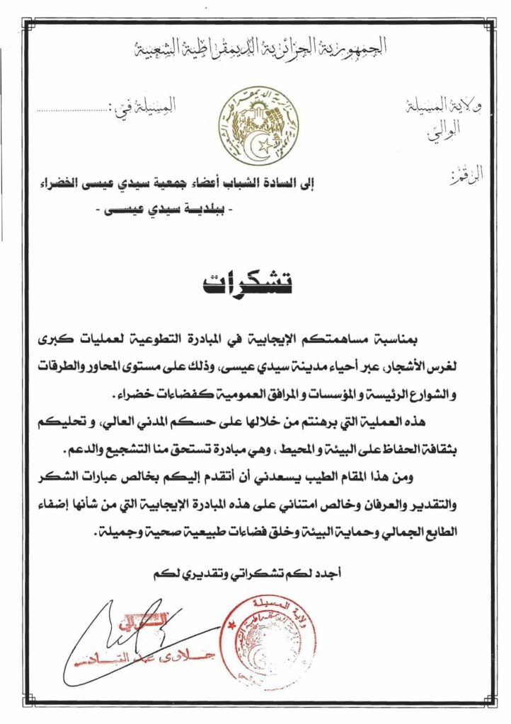 رسالة شكر للشباب المتطوع لمدينتي المسيلة وسيدي عيسى