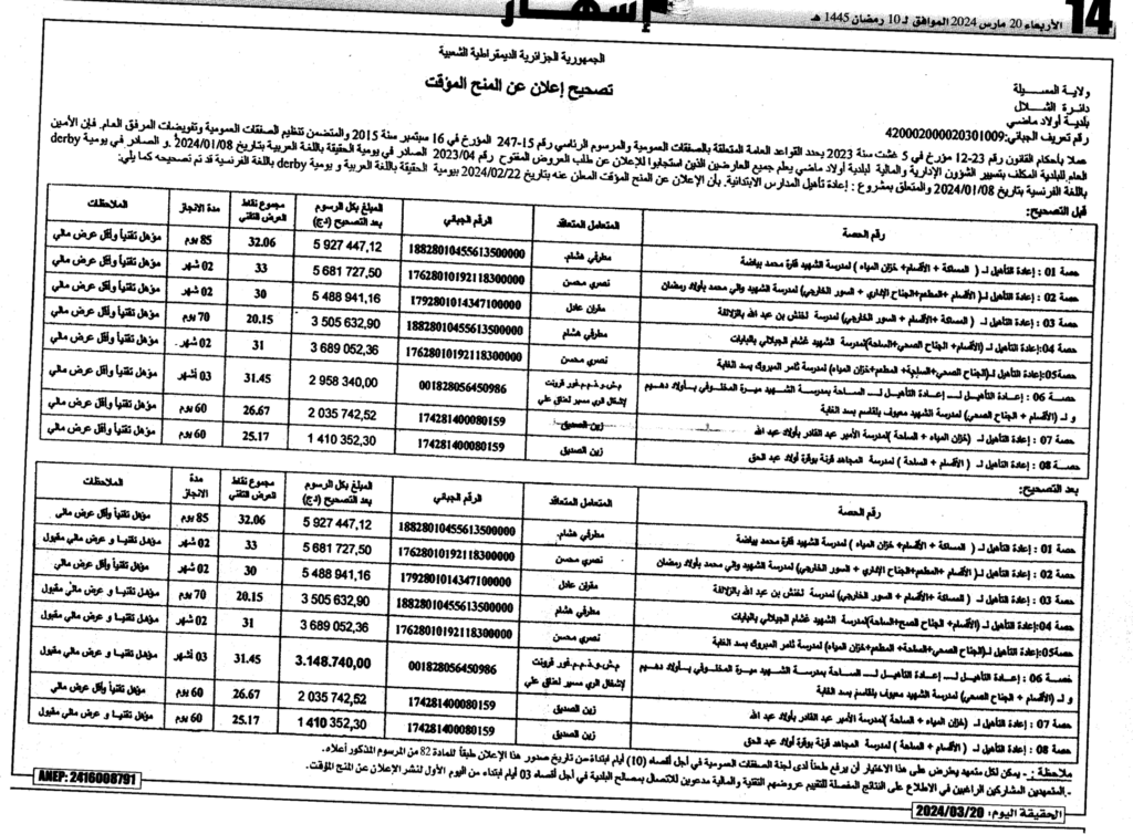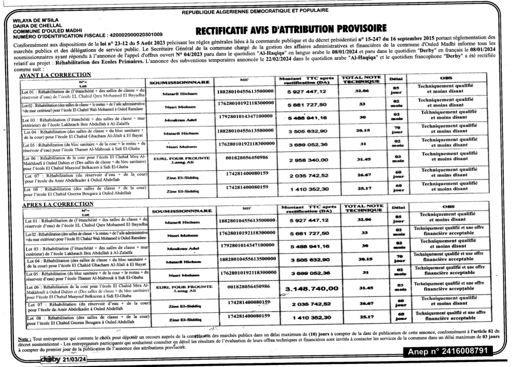 تصحيح إعلان عن المنح المؤقت: إعادة تأهيل المدارس الابتدائية/ بلدية أولاد ماضي