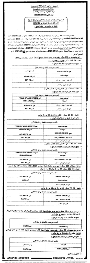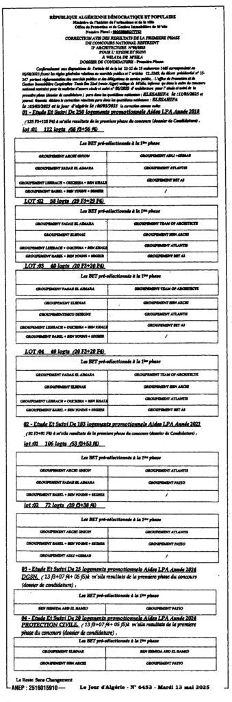 تصحيح الإعلان عن نتائج المرحلة الأولى من المسابقة الوطنية المحدودة في الهندسة المعمارية 2025/05/ ديوان الترقية والتسيير العقاري لولاية المسيلة