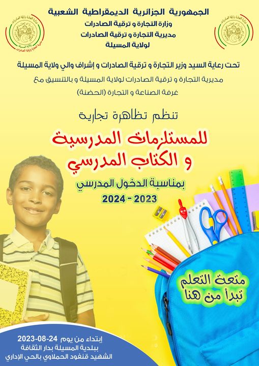المسيلة/ تحت رعاية السيد وزير التجارة وترقية الصادرات وإشراف السيد والي ولاية المسيلة، تنظم مديرية التجارة وترقية الصادرات لولاية المسيلة بالتنسيق مع غرفة التجارة والصناعة الحضنة تظاهرة تجارية “للمستلزمات المدرسية والكتاب المدرسي” تحسبا للدخول المدرسي 2023- 2024.