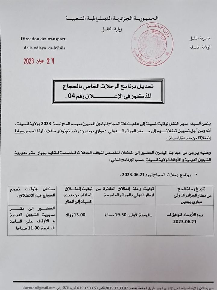 تعديل برنامج رحلات الحافلات المخصصة لنقل حجاجنا الميامين من المسيلة إلى مطار هواري بومدين بالعاصمة لأيام (21 /22 جوان 2023)21 يونيو، 20230 9 شاركها فيسبوك X مشاركة عبر البريد طباعة