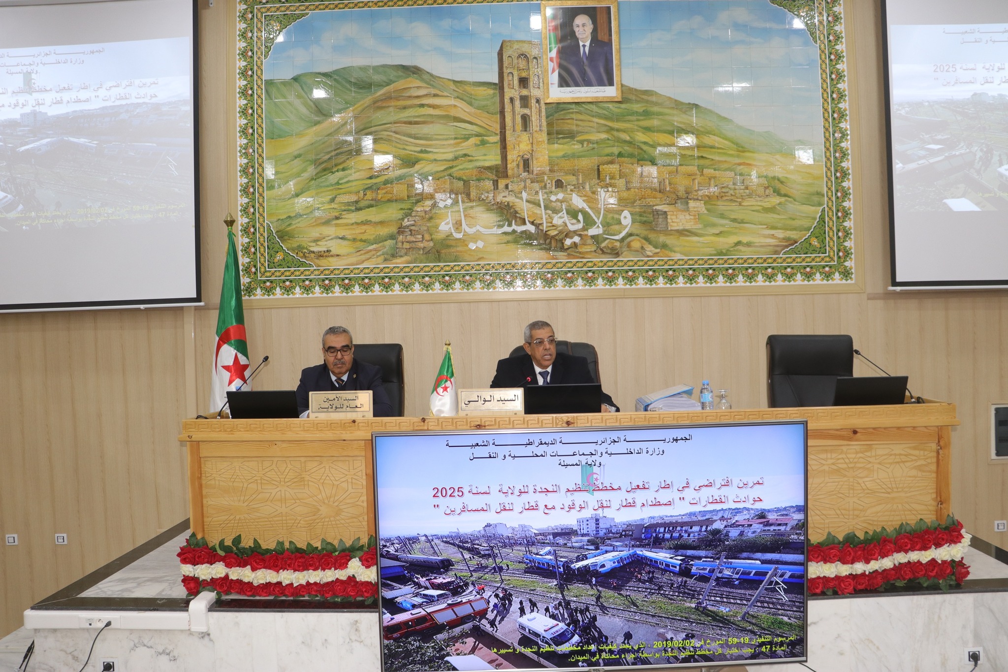 التحضير والتنسيق من أجل إجراء مناورة المحاكاة الولائية موضوعها “إصطدام قطار لنقل المحروقات مع قطار لنقل المسافرين” على مقربة من محطة القطار الكائنة بالمحطة البرية متعددة الأنماط بالمسيلة، في إطار تفعيل مخطط تنظيم النجدة للولاية لسنة 2025، لأجل اختبار إمكانيات الولاية في ميدان تسيير الكوارث.